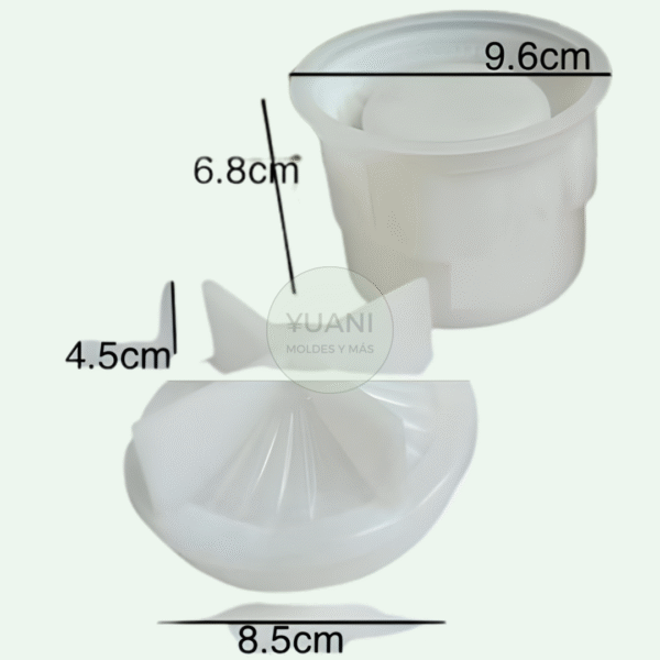 Medidas aproximadas: base 9.6 cm de diámetro por 6.8 cm de altura, tapa 8.5 cm de diámetro por 4.5 cm de altura